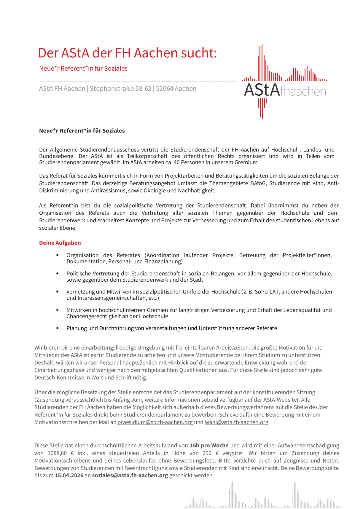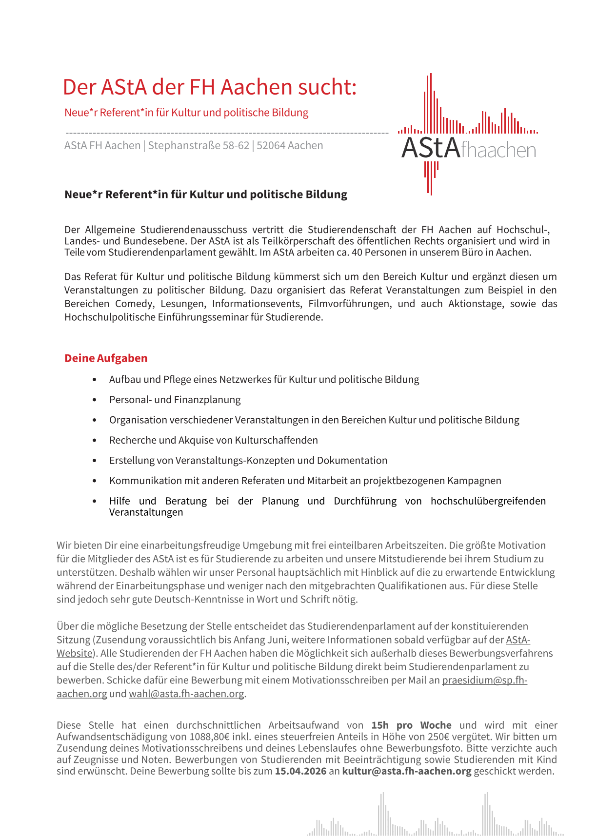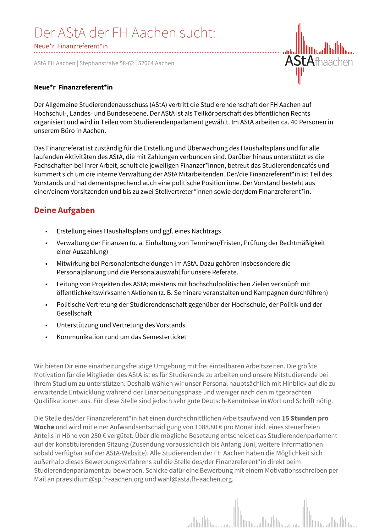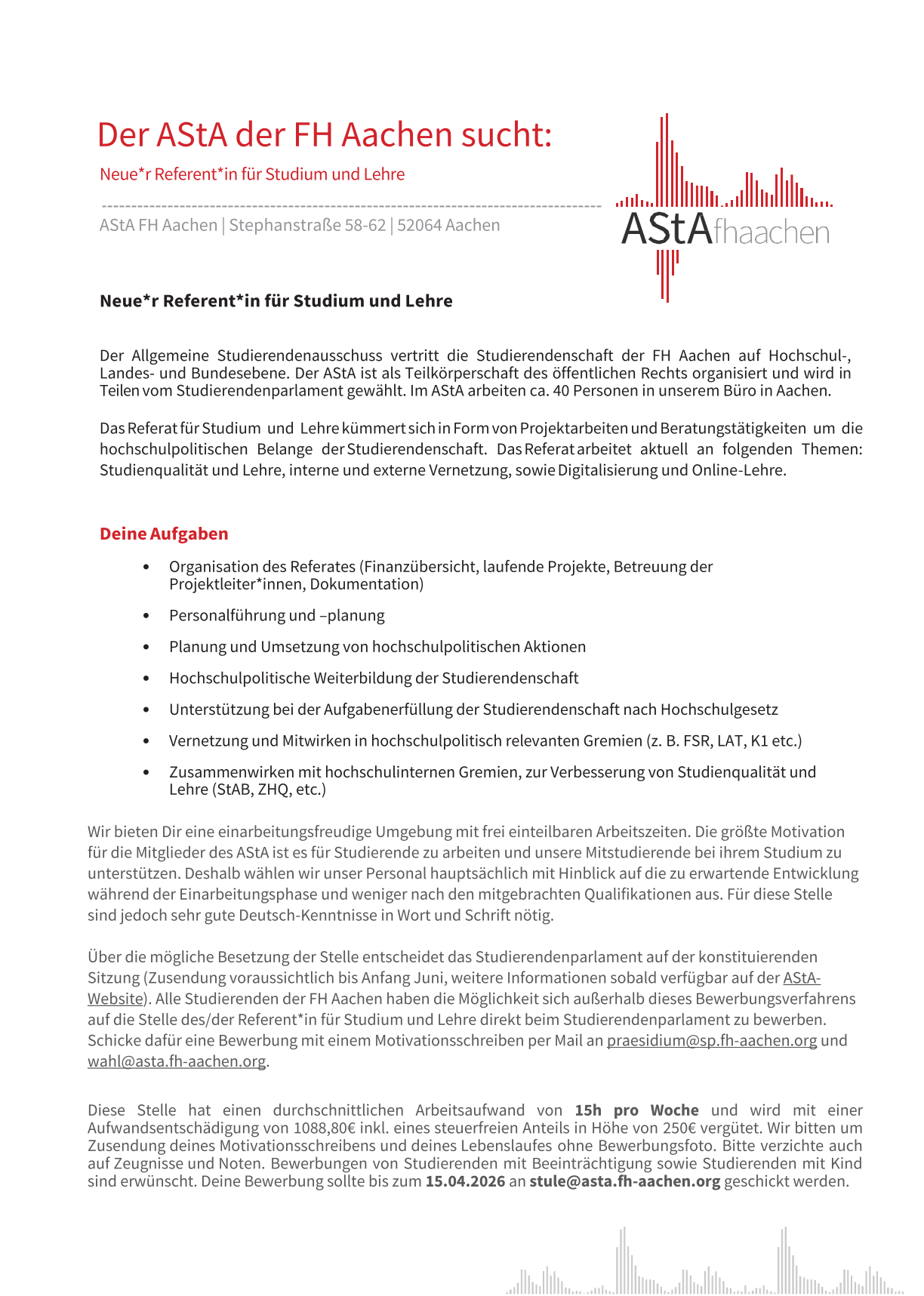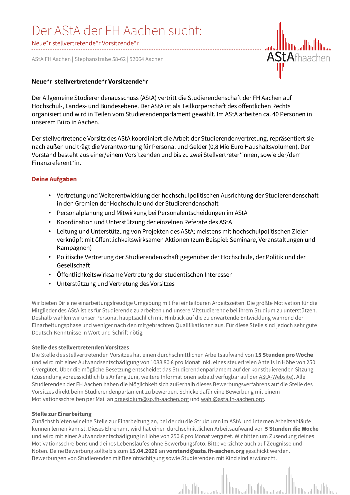 Bei Interesse schicke eine mail mit einer Interessensbekundung (Download) und aussagekräftigen Unterlagen bis zum 31.12.2025 an wahlen@fh-aachen.de.